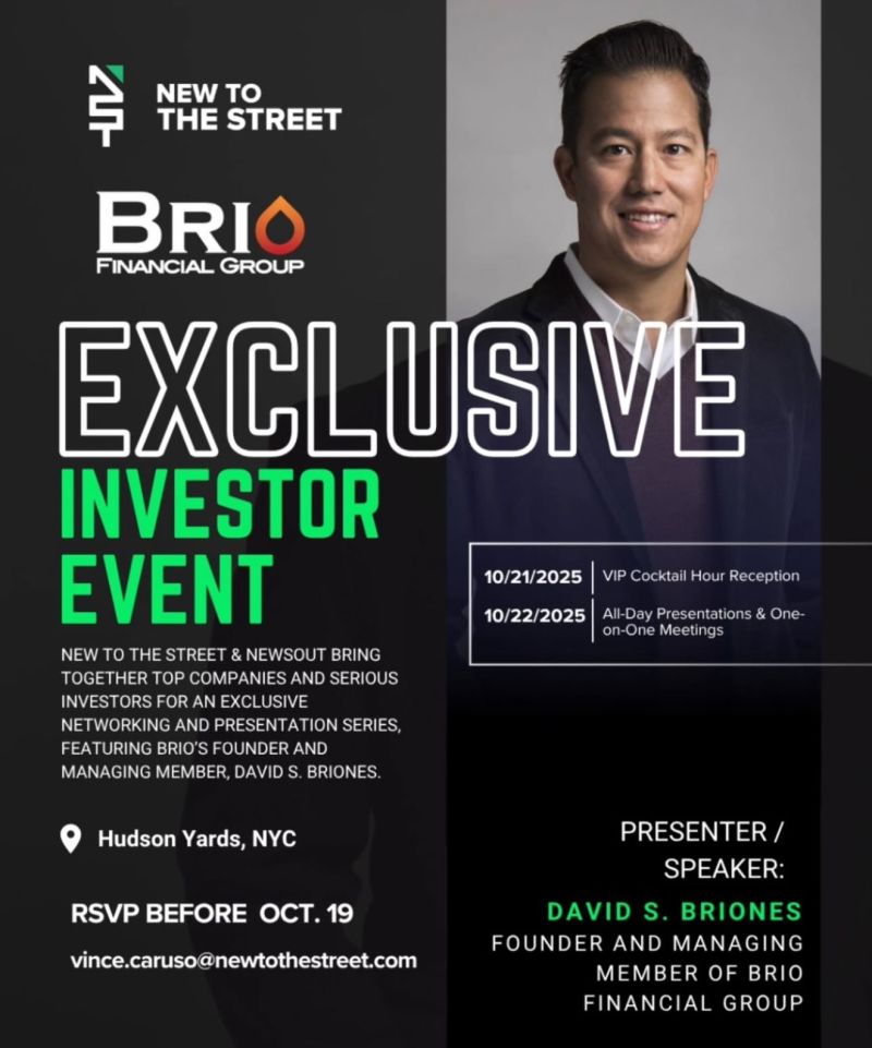 On October 22, I will be speaking at an investor event at Hudson Yards in New York, hosted by New to The Street, and presenting on behalf of Brio Financial Group, sharing insights from our work with growth stage companies and the evolving capital markets landscape.